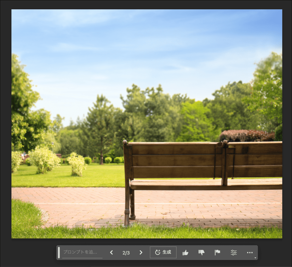 生成された3つのバリエーションを見ると、ベンチの背もたれの金具がなくなっていたり、奥の木々の部分など細かい部分に違いがあるのがわかります。