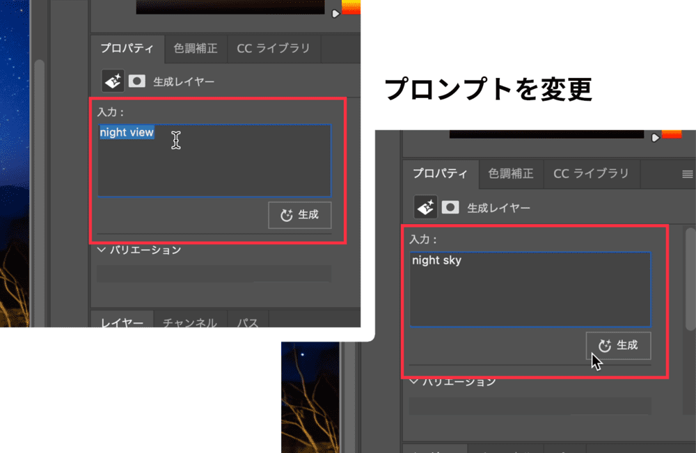プロパティのバリエーションの部分に生成された夜空の画像が追加になり、コンテキストタスクバーでも枚数が増えたことを確認できます。